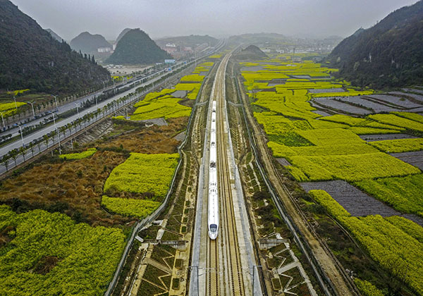 3月16日,一列動(dòng)車組列車在滬昆高鐵貴州安順段行駛。