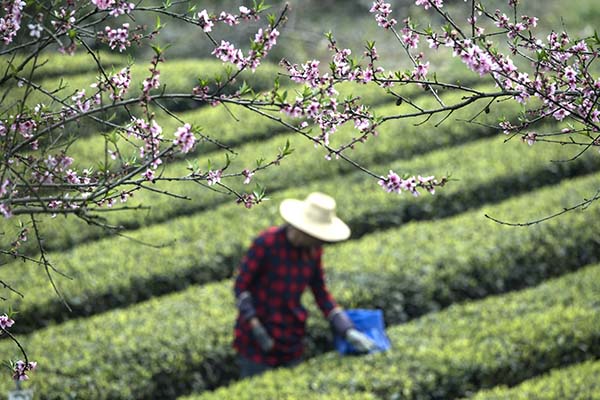 3月29日,湖北省宜昌市夷陵區(qū)太平溪鎮(zhèn)落佛村一名茶農(nóng)在采摘明前茶。