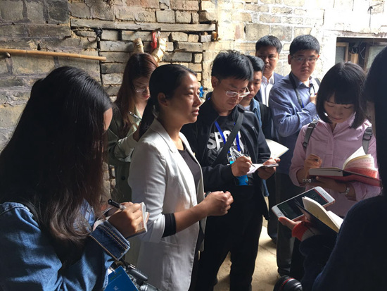 大灣村第一書記、扶貧工作隊隊長余靜(中)接受記者采訪 人民網(wǎng)記者羅旭 攝