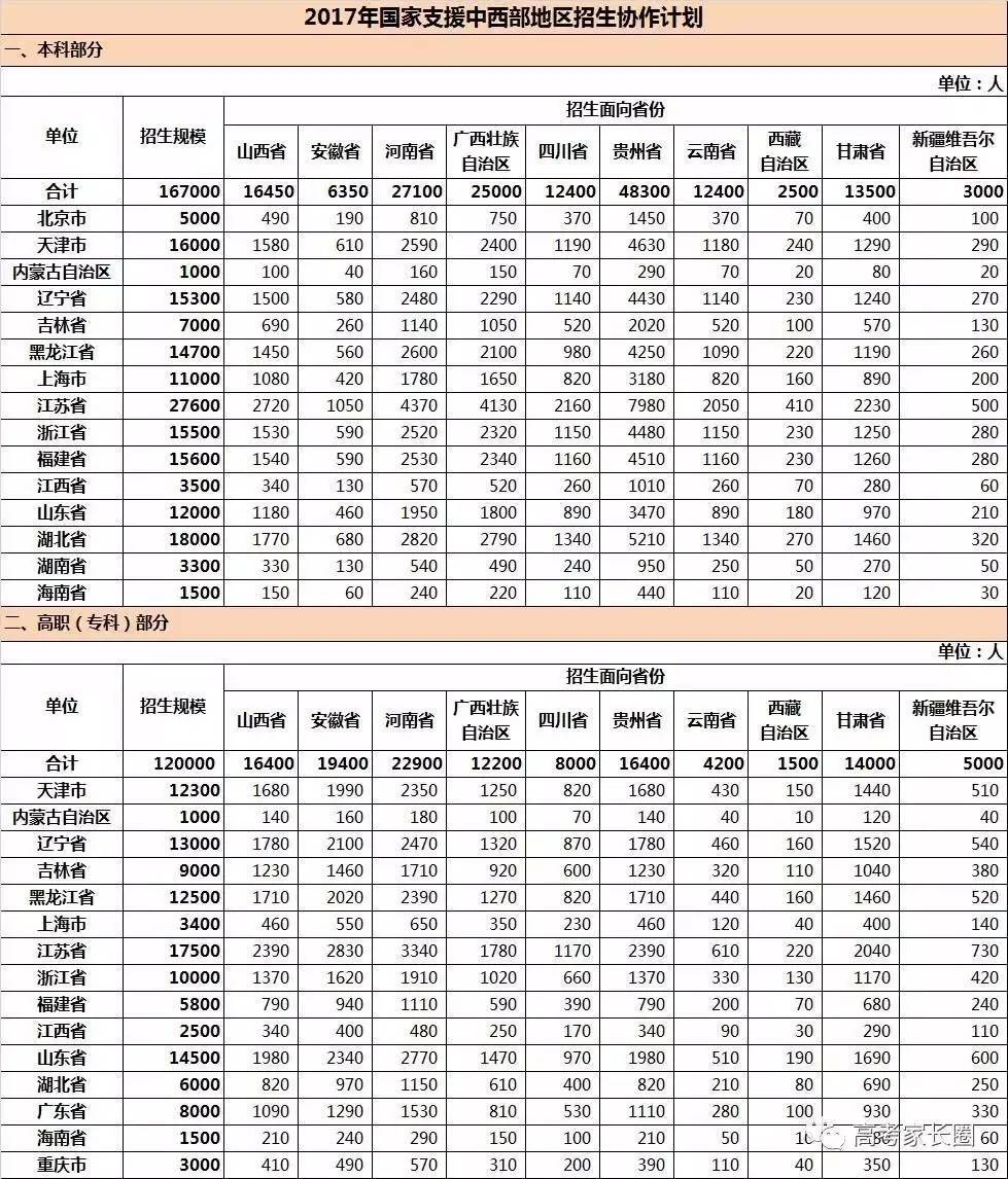 2017年,國家支援中西部地區(qū)招生協(xié)作計劃共安排28.7萬人,其中本科16.7萬人、?12萬人,主要由公辦高校承擔(dān)。