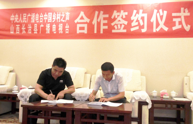 中央人民廣播電臺社教節(jié)目中心黨總支專職書記彭忠蛟與長治縣廣播電視臺臺長馮鵬威進行了簡短正式的合作簽約儀式,從今年10月1日起,長治縣的父老鄉(xiāng)親就可以聽到中國鄉(xiāng)村之聲的節(jié)目了。