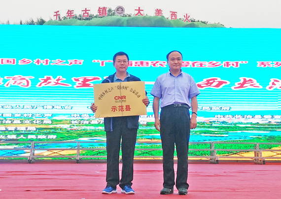 中央人民廣播電臺社教節(jié)目中心黨總支專職書記彭忠蛟授“中國鄉(xiāng)村之聲愛在鄉(xiāng)村公益活動示范縣”牌匾,長治縣廣播電視臺臺長馮鵬威接牌。