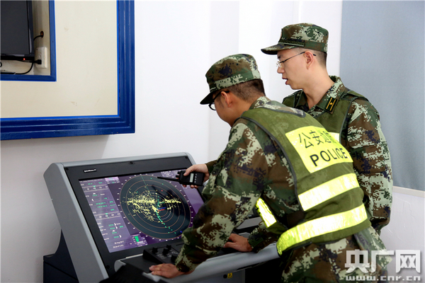 汕頭邊防支隊(duì)邊防媽嶼所官兵正在使用衛(wèi)星定位系統(tǒng)檢測(cè)周?chē)鷿O船停泊情況。