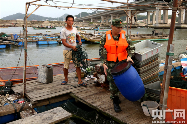 汕頭邊防支隊(duì)達(dá)濠邊防派出所官兵正在幫養(yǎng)殖戶收拾養(yǎng)魚(yú)工具。周峰 攝
