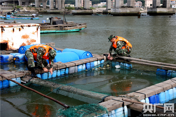 汕頭邊防支隊(duì)達(dá)濠邊防派出所官兵正在幫助漁民加固漁排。周峰 攝