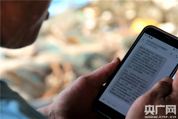 漁民向記者展示媽嶼邊防派出所邊防官兵發(fā)送的臺(tái)風(fēng)預(yù)警短信。劉建高 攝