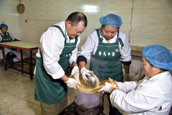 臘八祭灶,年下來(lái)到。過(guò)年離不開(kāi)芝麻糖。二十三,糖瓜沾。圖為安陽(yáng)崔家橋鎮(zhèn)董曹馬村“百年芝麻糖非遺傳承人”申運(yùn)海(左)和妻子(中)、姐姐(右)制作祖?zhèn)髅丶肌肮嗵恰。灌糖的時(shí)候三人要配合好,1秒左右倒入果仁碎、合攏,力度和時(shí)間都要掌握的十分準(zhǔn)確,否則就是合籠失敗。