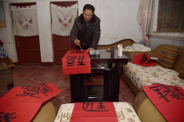 河南鶴壁淇縣馬疙瘩村60歲退休老教師朱全貴老師在家蒸好花糕后,緊接著要書(shū)寫(xiě)對(duì)聯(lián),朱老師在鄉(xiāng)里任教幾十年,桃李滿天下,每年他都幫助別人寫(xiě)對(duì)聯(lián),這是他自己獨(dú)創(chuàng)的書(shū)寫(xiě)對(duì)聯(lián)方式,大家猜猜這是啥字?