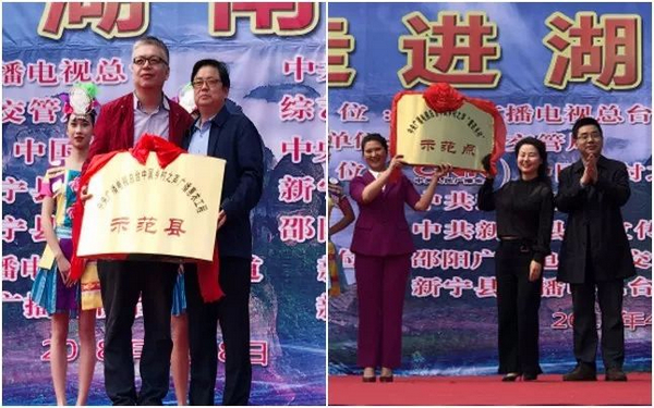 演出開始前,中央廣播電視總臺與新寧縣舉行簽約儀式,授予新寧縣“中央廣播電視總臺中國鄉(xiāng)村之聲廣播惠農(nóng)工程示范縣”和“中央廣播電視總臺中國鄉(xiāng)村之聲‘愛在鄉(xiāng)村’示范點”稱號。
