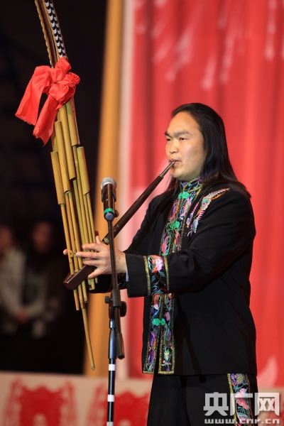 楊正平在頒獎(jiǎng)晚會(huì)現(xiàn)場(chǎng)演奏蘆笙