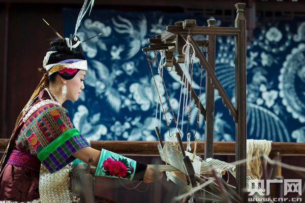 在苗族姑娘歐陽(yáng)珍珍的博物館一樓,幾十臺(tái)從民間搜羅的古老的紡線機(jī)與紡織機(jī)發(fā)出“沙沙沙”的聲音,一群苗族的老人正在做著她們一輩子都在做的事兒,紡線與織布。