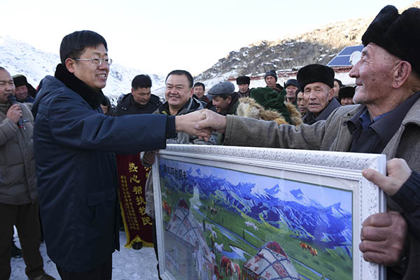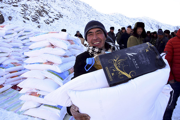 在距離塔城市300公里的托里縣多拉特鄉(xiāng)“冬窩子”哈拉包爾,阿克塞村村民領(lǐng)到援疆干部送來(lái)的生活物資(12月3日攝)。