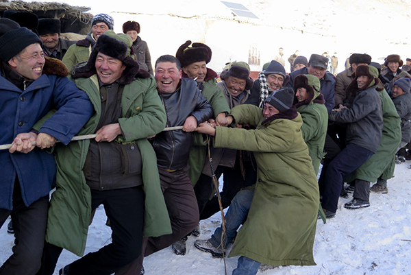 在距離塔城市300公里的托里縣多拉特鄉(xiāng)“冬窩子”哈拉包爾,阿克塞村村民和援疆干部一起進(jìn)行拔河比賽(12月3日攝)。