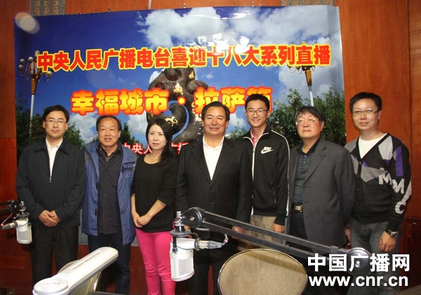 拉薩市委副書記、市長多吉次珠在直播前與中央人民廣播電臺和西藏人民廣播電臺編播人員合影留念
