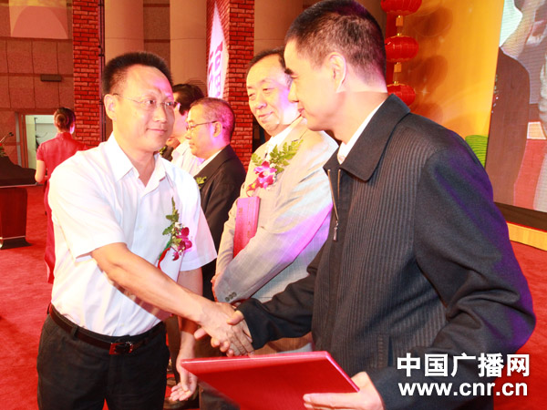 中央人民廣播電臺中國鄉(xiāng)村之聲開播儀式今日在北京舉行,圖為中央人民廣播電臺副臺長趙子忠(左)為中國鄉(xiāng)村之聲專家顧問團(tuán)代表頒發(fā)聘書。