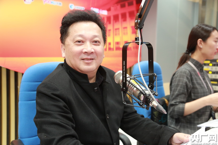 中國文聯(lián)演藝中心主任、全國政協(xié)委員、著名軍旅歌唱家、中國文學(xué)藝術(shù)界2016春節(jié)大聯(lián)歡——《百花迎春》總導(dǎo)演郁鈞劍做客中國之聲《中國大舞臺》(央廣網(wǎng) 李聰格 攝)