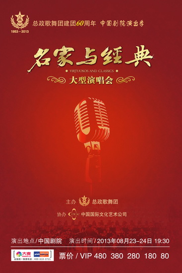 大型演唱會《名家與經(jīng)典》以全明星陣容在中國劇院上演,以內(nèi)部紀(jì)念專場的形式正式拉開總政歌舞團(tuán)60周年“中國劇院演出季”的帷幕。8月23日、24日,總政歌舞團(tuán)的歌唱家們還將連續(xù)兩天為普通觀眾獻(xiàn)上該經(jīng)典演出。
