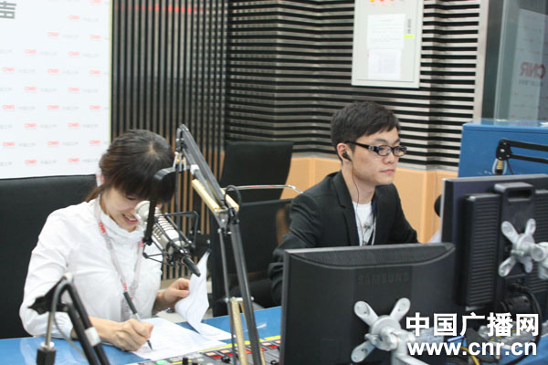 中國之聲主持人宇菲(左)和胡凡正在緊張的直播中。