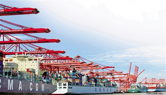 在塔吊林立、集裝箱成山的寧波舟山港,裝載上4000個(gè)集裝箱的出口貨物后,體型龐大的“地中海杰德”號鳴笛起航,這些貨物將被運(yùn)往“一帶一路”沿線國家的市場。