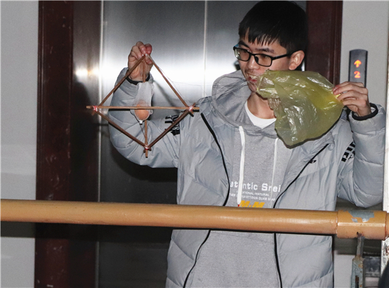 比賽分為設(shè)計(jì)比拼和技術(shù)比拼兩部分。每個(gè)小組首先要對(duì)模型進(jìn)行展示,讓觀眾、評(píng)委老師對(duì)選手的設(shè)計(jì)有初步的印象和了解,隨后進(jìn)入激動(dòng)人心的技術(shù)比拼環(huán)節(jié),各小組帶著他們的裝置及雞蛋來(lái)到了實(shí)驗(yàn)室四樓準(zhǔn)備就緒。裝置設(shè)計(jì)牛不牛?一摔便知曉!