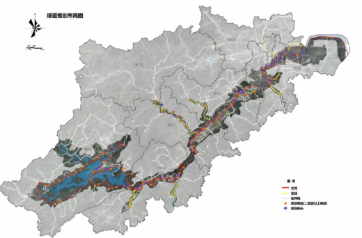 支線包括運(yùn)河、湘湖、浦陽(yáng)江、淥渚江、壺源溪、分水江、蘭江、壽昌江等重要支流沿岸的綠道;