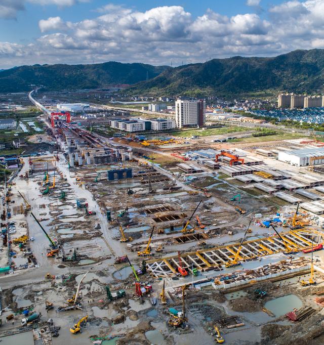 杭紹臺鐵路臺州中心站施工現(xiàn)場,幾十臺大型機械同時作業(yè)形成一片大干之勢 郎成濤 攝