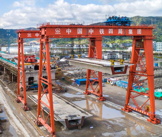 杭紹臺鐵路施工現(xiàn)場,900噸運梁機正在運送箱梁 郎成濤 攝