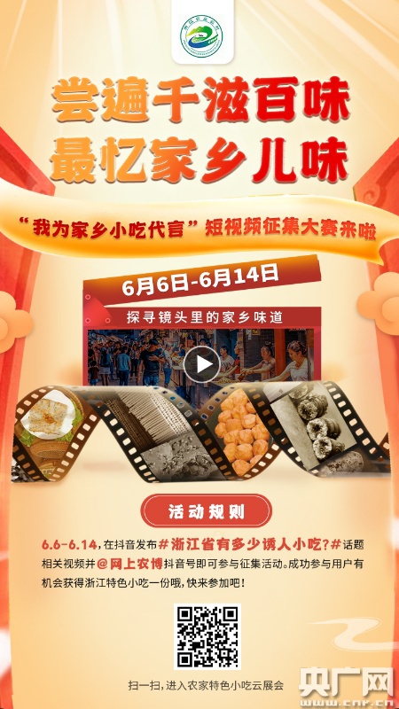此外,在6月6-14日期間,拍攝展現(xiàn)家鄉(xiāng)小吃內(nèi)容,發(fā)布于抖音并@『網(wǎng)上農(nóng)博』抖音號,即可參加“我為家鄉(xiāng)小吃代言”短視頻征集活動,成功參與客戶有機會獲得浙江農(nóng)家特色小吃1份。