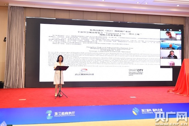 央廣網(wǎng)杭州6月11日消息(記者謝夢(mèng)潔 魏煒 實(shí)習(xí)生李維雯 通訊員宋桔麗 張潔)6月11日,第22屆(網(wǎng)上)浙洽會(huì)——國家數(shù)字服務(wù)出口基地浙江企業(yè)全球推介會(huì)在杭州舉辦。本次推介會(huì)通過線上線下相結(jié)合的形式舉行,會(huì)上,國家數(shù)字服務(wù)出口基地在濱江物聯(lián)網(wǎng)產(chǎn)業(yè)園正式揭牌。此外,杭州高新區(qū)(濱江)物聯(lián)網(wǎng)產(chǎn)業(yè)園與“Tomorrow City--明日之城”項(xiàng)目戰(zhàn)略合作備忘錄簽約儀式也一同進(jìn)行。