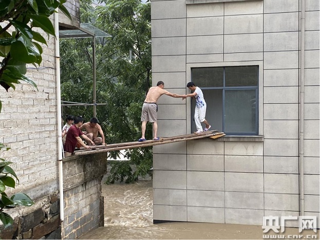 “抓住我的手!慢點走!”8點55分,在宋村鄉(xiāng)鏡洪村,村干部架起一座簡易橋,接出了被洪水困在家里的農(nóng)戶張中華。原來,張中華的房子地勢比較低,早晨一覺醒來就發(fā)現(xiàn)被洪水包圍了。鄉(xiāng)里包村干部和村里干部獲悉后,迅速抵達現(xiàn)場接應(yīng)。很快,村書記張三木和村委主任張紅鳳找來幾根木頭,大家在隔壁房子里架出一座橋,搭在張中華房子的窗戶口,幾名熱心的村民更是光著膀子上陣攙扶,最終將張中華接出了被困房屋。