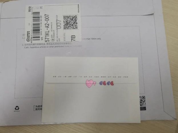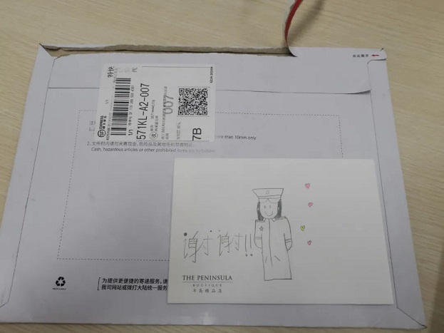 拆開快遞封條,像是一封信。封面畫了一個可愛的警察姐姐,一旁手寫兩個字:謝謝,封口還畫了一個愛心。應(yīng)該是個孩子畫的,還蠻用心。
