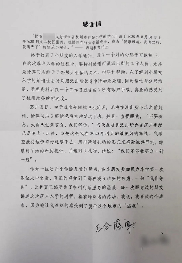 打開信封,這下大家都懂了,原來是杭州一對母女專程寫給派出所戶籍輔警徐萍的信,感謝她“創(chuàng)造奇跡”。