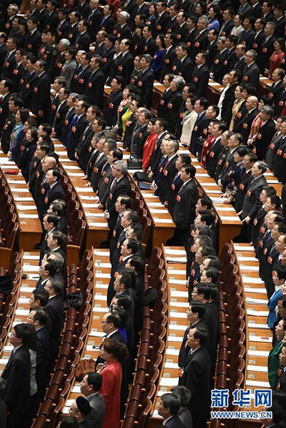 3月15日,全國政協(xié)十三屆一次會議在北京人民大會堂舉行閉幕會。這是委員們高唱國歌。 新華社記者 龐興雷 攝