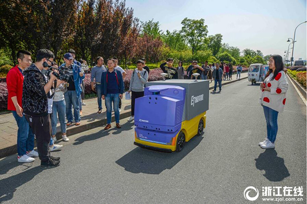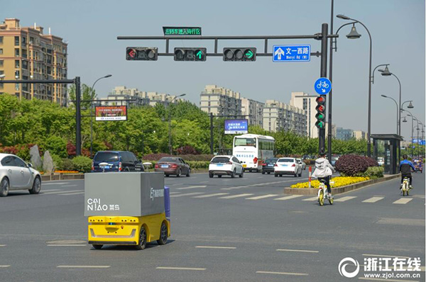 2018年4月18日,在杭州市文一西路上,一輛半人高的四方小車,在無人駕駛的情況下,一路停停走走,行駛在送快遞的路上。據(jù)了解,這是菜鳥旗下ET物流實驗室研發(fā)的無人車,正在進行路測。當日,在10公里的路測路段,無人車已經(jīng)能夠完成內(nèi)部的文件等收發(fā)配送。菜鳥無人車定位在末端配送,車速最高控制在15km/小時,車輛制動距離可以控制在0.5——0.3米。菜鳥無人車量產(chǎn)商用在即,年內(nèi)將全面進入末端進行配送。(記者 楊曉軒 攝)