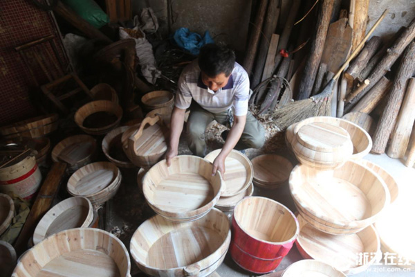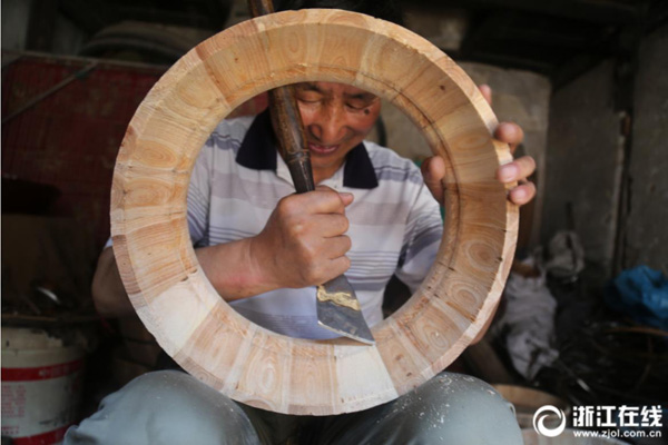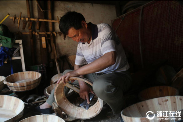 5月15日,在湖州市吳興區(qū)埭溪鎮(zhèn)茅塢街一條偏僻巷子里,上強村村民崔國良在箍桶,為山村一位即將出嫁的新娘制作精良的“嫁妝”。