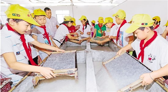桃花紙是一種用于書寫和繪畫的傳統(tǒng)紙質(zhì)材料。近日,杭州市臨安區(qū)於潛鎮(zhèn)千洪小學(xué)的孩子們來到位于當(dāng)?shù)貤詈榇宓奶一埛沁z文化體驗園,體驗桃花紙的制作流程,通過實踐更好地了解非遺知識。(本報記者 林云龍 胡楊 攝)