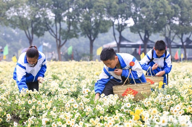 11月4日,桐鄉(xiāng)市石門鎮(zhèn),不少家長(zhǎng)帶著孩子在白馬塘村的菊海里挎著竹籃,體驗(yàn)杭白菊采摘。