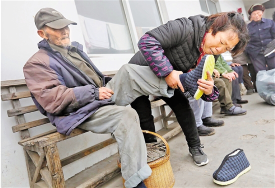 近日,常山縣大橋頭鄉(xiāng)客弄村傅珍芳(右)為衢江上方鎮(zhèn)和灰坪鄉(xiāng)的敬老院送去70雙棉鞋,F(xiàn)年60歲的她從2009年開始免費(fèi)為衢州幾十家敬老院和附近村莊老人縫制過冬棉鞋,共送出6000多雙棉鞋,被大家親切地稱為“棉鞋阿姨”。(拍友 鮑衛(wèi)東 錢李源 攝)