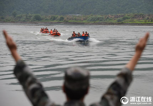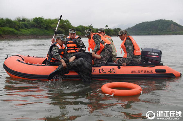 5月15日,杭州臨安區(qū)潛川鎮(zhèn),基層黨員、民兵進行沖鋒舟救援技能訓(xùn)練。