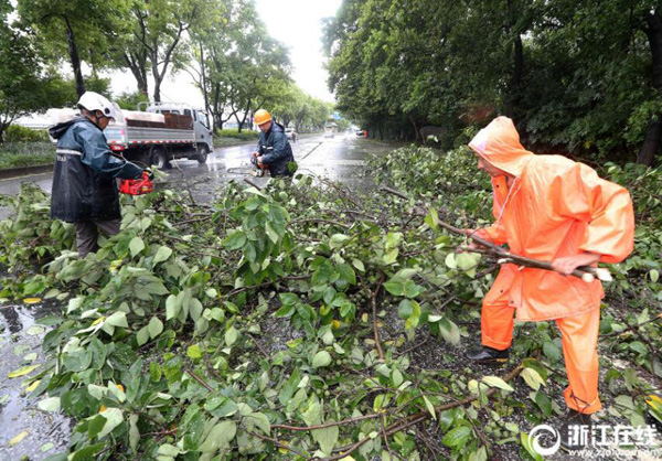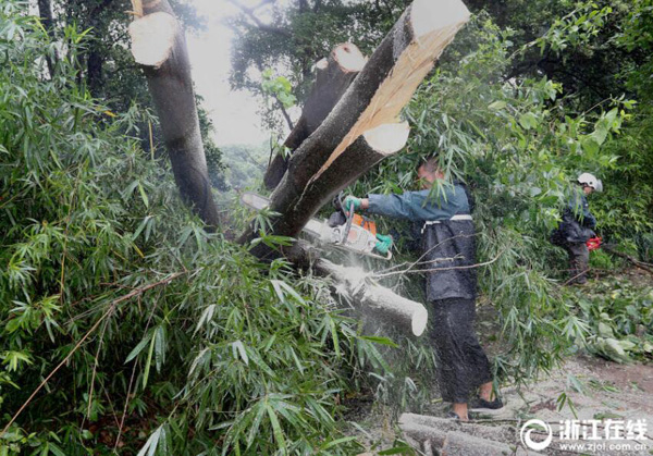 8月10日,臺風“利奇馬”凌晨登陸后,杭州多處樹木倒伏,西湖景區(qū)相關部門工作人員全力以赴搶扶樹木,確保道路暢通。