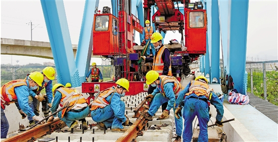 4月18日,全長8.355公里的金臺鐵路重點(diǎn)控制性工程金華市永康江特大橋貫通。金臺鐵路復(fù)工建設(shè)以來,承建全線梁架和鋪軌施工的中鐵一局集團(tuán),在確!傲阋咔椤焙桶踩|(zhì)量的前提下,按下項(xiàng)目建設(shè)“加速鍵”,力爭奪回疫情造成的停工損失,確保鐵路按期建成通車。圖為金臺鐵路永康江特大橋建設(shè)現(xiàn)場,工人們正在緊張施工。