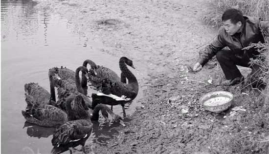 劉善云給黑天鵝喂食玉米。