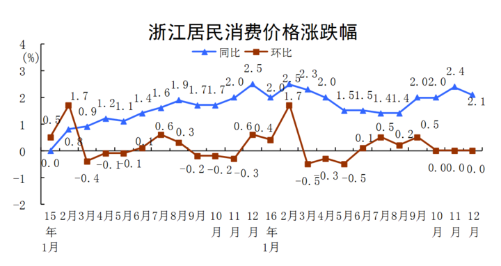 同時(shí),12月份其他用品和服務(wù)、醫(yī)療保健、教育文化和娛樂(lè)、衣著、居住、交通和通信、生活用品及服務(wù)價(jià)格等其他七大類(lèi)價(jià)格分別上漲2.9%、2.3%、2.2%、2.1%、2.0%、1.2%、0.2%。