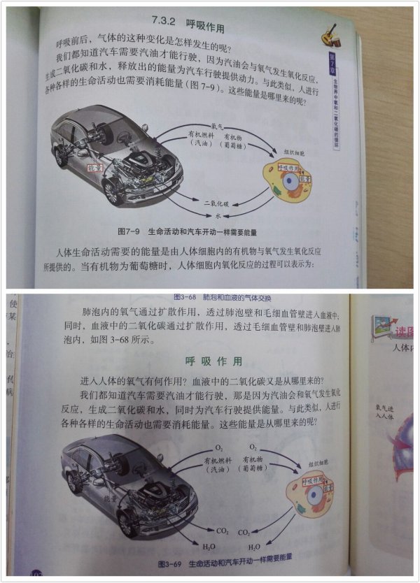 不過,出口教材也保留了部分國內版的原版風貌。在《科學》八年級下冊,同樣是介紹“呼吸作用”知識點,兩本教材生動地使用了同一個形象類比圖片,以汽車開動需要使用能量循環(huán)為示例,詳細展示了生命活動和汽車開動一樣需要能量。