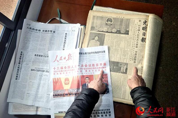 “這是3月21日的黨報,今年兩會閉幕了,我的這一屆兩會報道內容的報紙搜集工作也算是完成了!84歲的浙江諸暨老人黃仕根,把這張刊載著今年兩會閉幕報道的報紙鄭重地插進桌上的報夾,用手撫了撫報紙上的褶皺,露出了笑容。