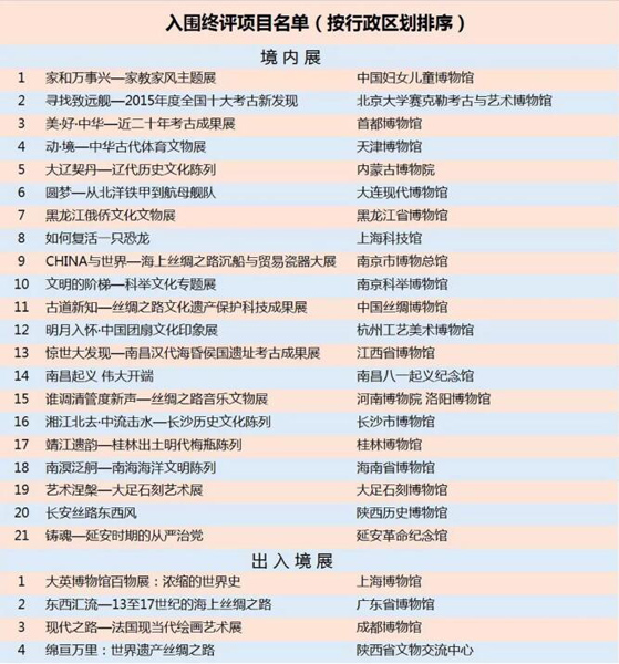 按照推介活動(dòng)計(jì)劃,將組織本屆“十大精品”入圍終評(píng)項(xiàng)目網(wǎng)上展示和公眾留言、評(píng)議,終評(píng)名單將于“5·18國(guó)際博物館日”公布。