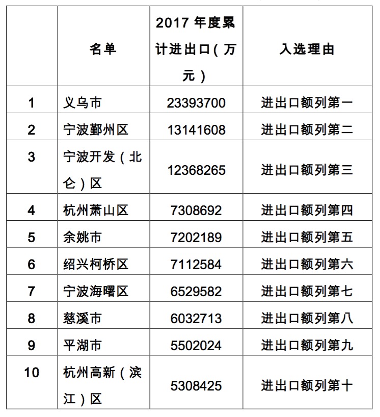 5月9日在杭州召開的全省對(duì)外開放大會(huì)上,2017年度浙江省外貿(mào)十強(qiáng)縣(市、區(qū))正式出爐,義烏市、寧波市鄞州區(qū)、寧波市北侖區(qū)位列“三甲”,杭州市蕭山區(qū)、余姚市、紹興市柯橋區(qū)、寧波市海曙區(qū)、慈溪市、平湖市、杭州高新開發(fā)區(qū)緊隨其后。