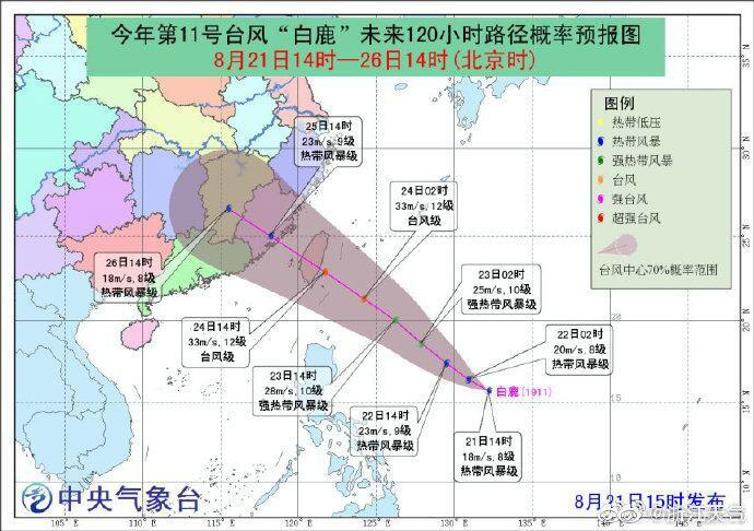 22日8時(shí),第11號(hào)臺(tái)風(fēng)“白鹿”中心位于臺(tái)灣省花蓮市東南方向約1230公里。預(yù)計(jì)將以每小時(shí)18公里左右的速度向西北方向移動(dòng),逐漸向臺(tái)灣東部沿?拷。